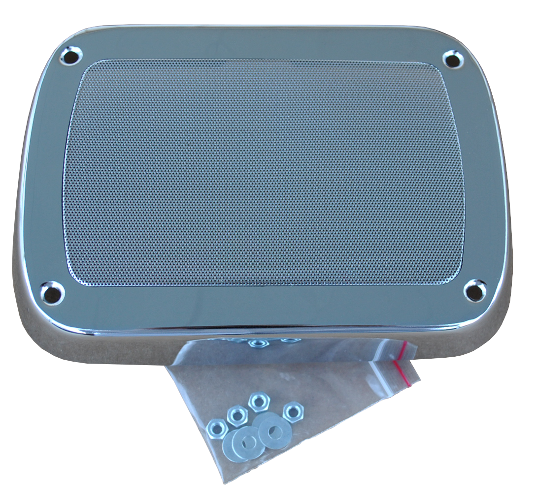 0847-672 This chrome radio speaker grille fits:1955-1959 Chevrolet Pickup Truck1955-1959 GMC Pickup TruckMeasurement 8 1/4" x 5 1/4" x 2"